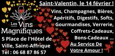 NOUS SERONS RAVIS DE VOUS ACCUEILLIR ET DE VOUS SERVIR À LA CAVE À SAINT-AFFRIQUE, TOUT AU LONG DE CE NOUVEAU MILLÉSIME, ET NOTAMMENT POUR LES DEUX FÊTES À VENIR : CHANDELEUR LE 2 FÉVRIER ET SAINT-VALENTIN LE 14 FÉVRIER.